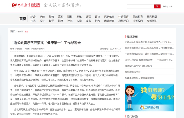 3月12日,甘肃省教育厅召开落实“健康第一”工作部署会,深入贯彻教育部会议精神及省委、省...